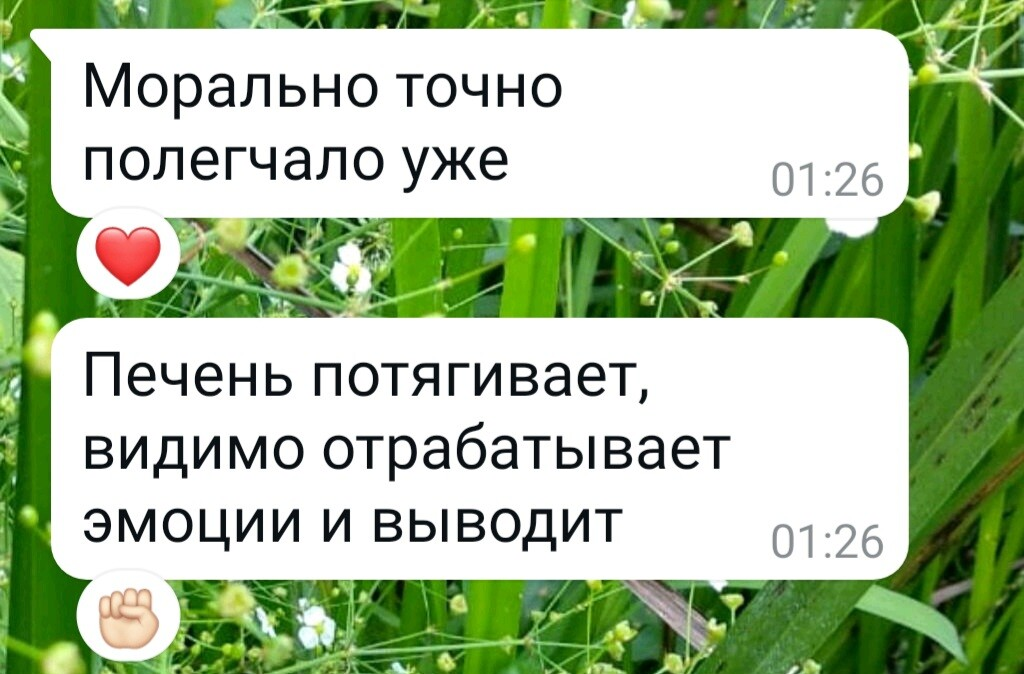 желудку и сердцу. А дальше она мне ответила — мне уже полегчало. Какое-то время потягивало печень. Но, тоже успокоилось.